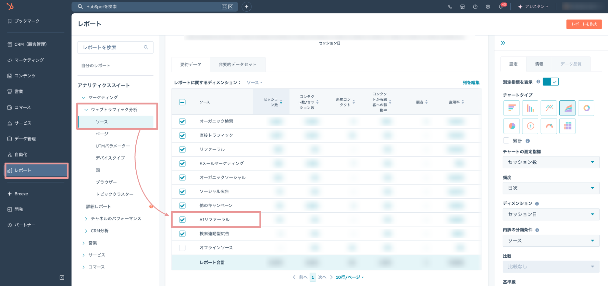 [レポート]>[アナリティクススイート]>[ウェブトラフィック分析]で、AIリファーラルデータを確認できます。