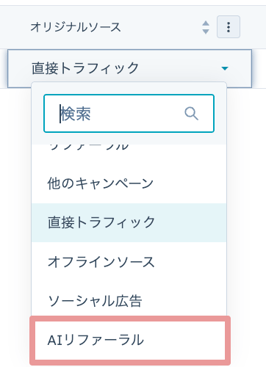 新しいAIリファーラル経由でコンタクトが活動(アクティビティー)を行うと、そのコンタクトの「オリジナルソース」や「最新トラフィックソース」のプロパティーも、必要に応じて「AIリファーラル」として更新されます。
