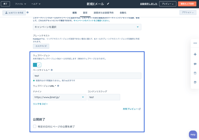 HubSpotでは送信するメールのWebバージョンを作成することができます。Eメールの内容をそのままWebサイトページとして公開できます。