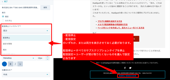 HubSpotのマーケティングメールの場合は、「配信停止」「配信設定」のいずれか、または両方のリンクを表示させることを必須にしています。