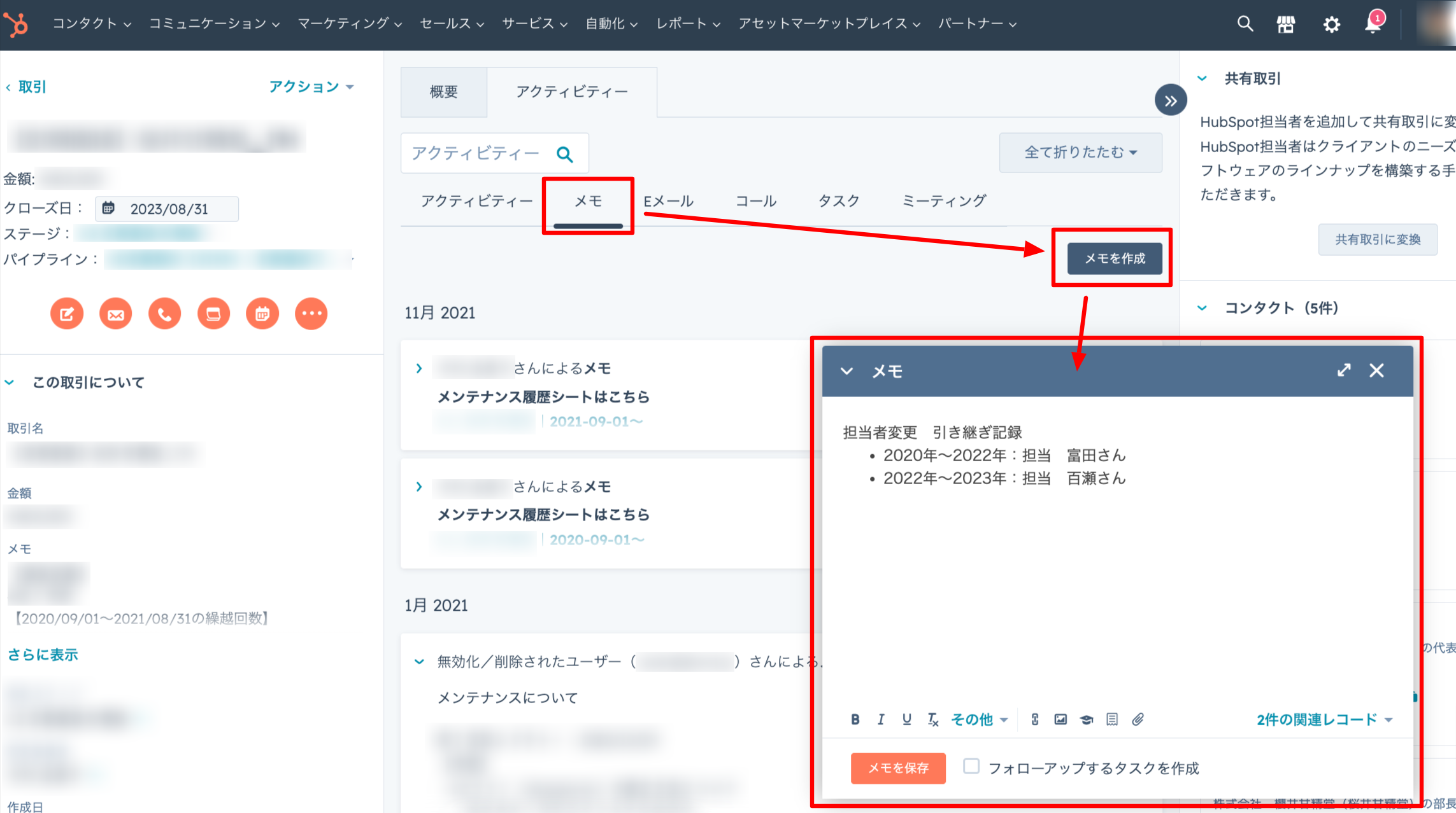 「コンタクト」「会社」「取引」それぞれ、「メモ」の機能を使い、担当者情報や引き継ぎ情報を記録すると良いでしょう。